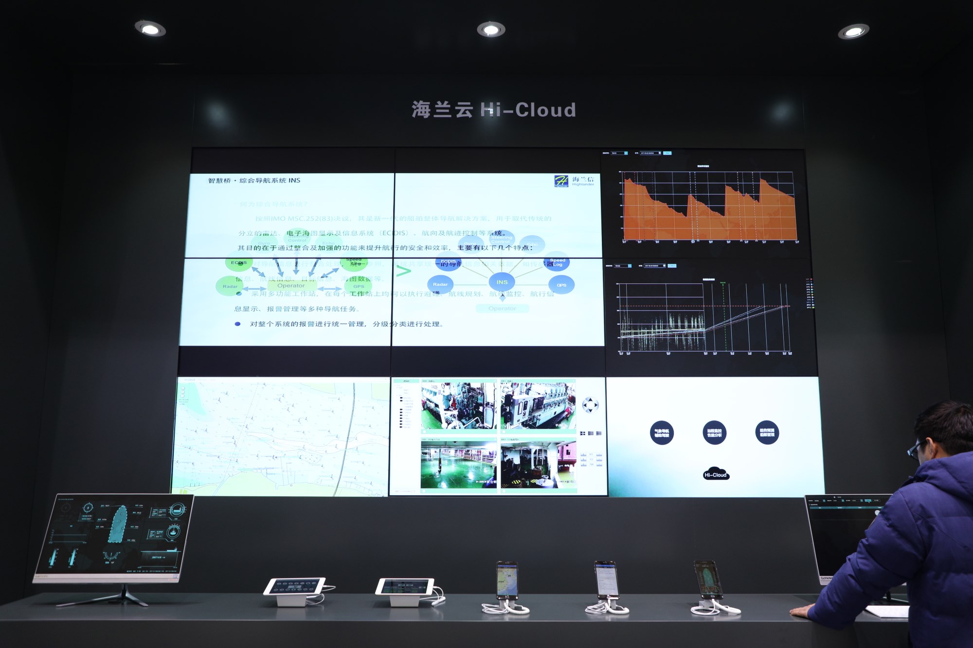 在智能航海區域,海蘭信聚焦船岸一體化系統解決方案,展示了船舶智能導航系統、Hi-Cloud(海蘭云)、Evolution V5綜合監測報警和控制系統等,打破“信息孤島”,有能力為客戶提供船舶智能化綜合解決方案。在智慧海洋區域,海蘭信呈現“天、空、岸、海、底”海洋立體觀監測系統,重點展示了近海雷達綜合監控系統、海底觀測網系統、無人機動智能平臺系統、國家海域動態監視監測管理系統等,為涉海用戶提供定制化的海洋數據信息服務,服務海洋經濟發展,為“一帶一路”建設提供支撐。